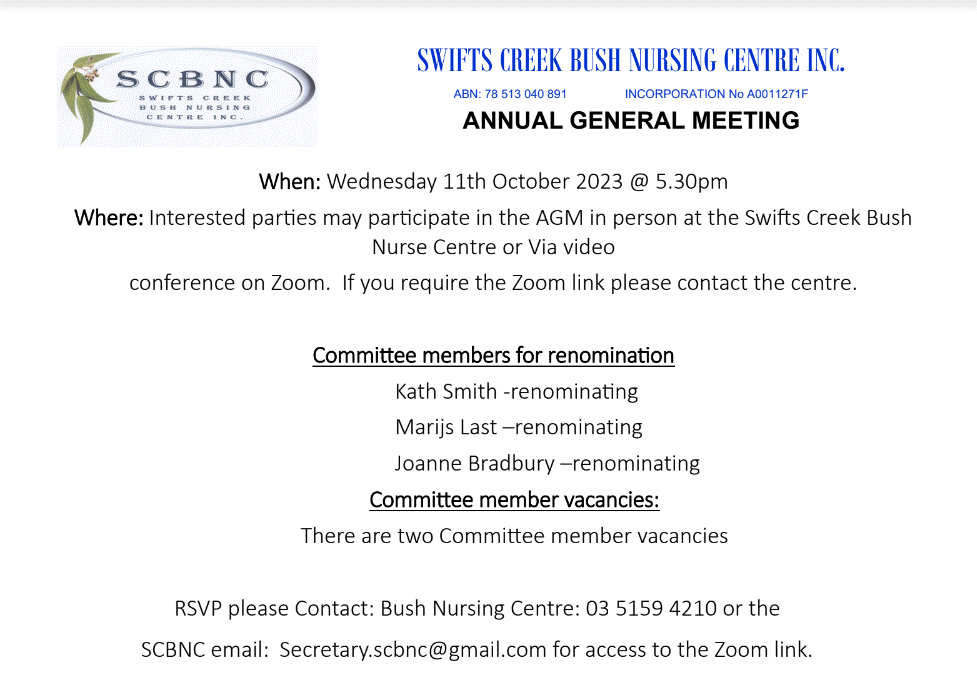 The Swifts Creek Bush Nursing Centre [SCBNC] is a not-for profit health provider servicing the Swifts Creek and surrounding district. The SCBNC is managed by a volunteer committee of management. The COM employs a full time Bush Nurse Manager and a number of other casual or part time employees. SCBNC has a membership of 519 […]