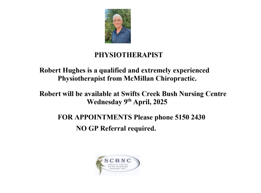 PHYSIOTHERAPIST Robert Hughes visit on 9th April 2025 Posted on March 24, 2025 by swiftscreekbushnursingcentre_nakj5p