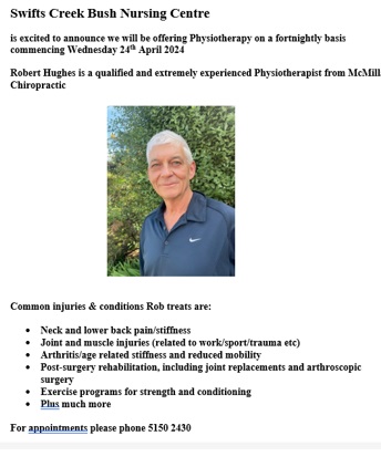 Physiotherapy available on a fortnightly basis commencing Wednesday 24th April 2024 Posted on April 14, 2024April 14, 2024 by swiftscreekbushnursingcentre_nakj5p